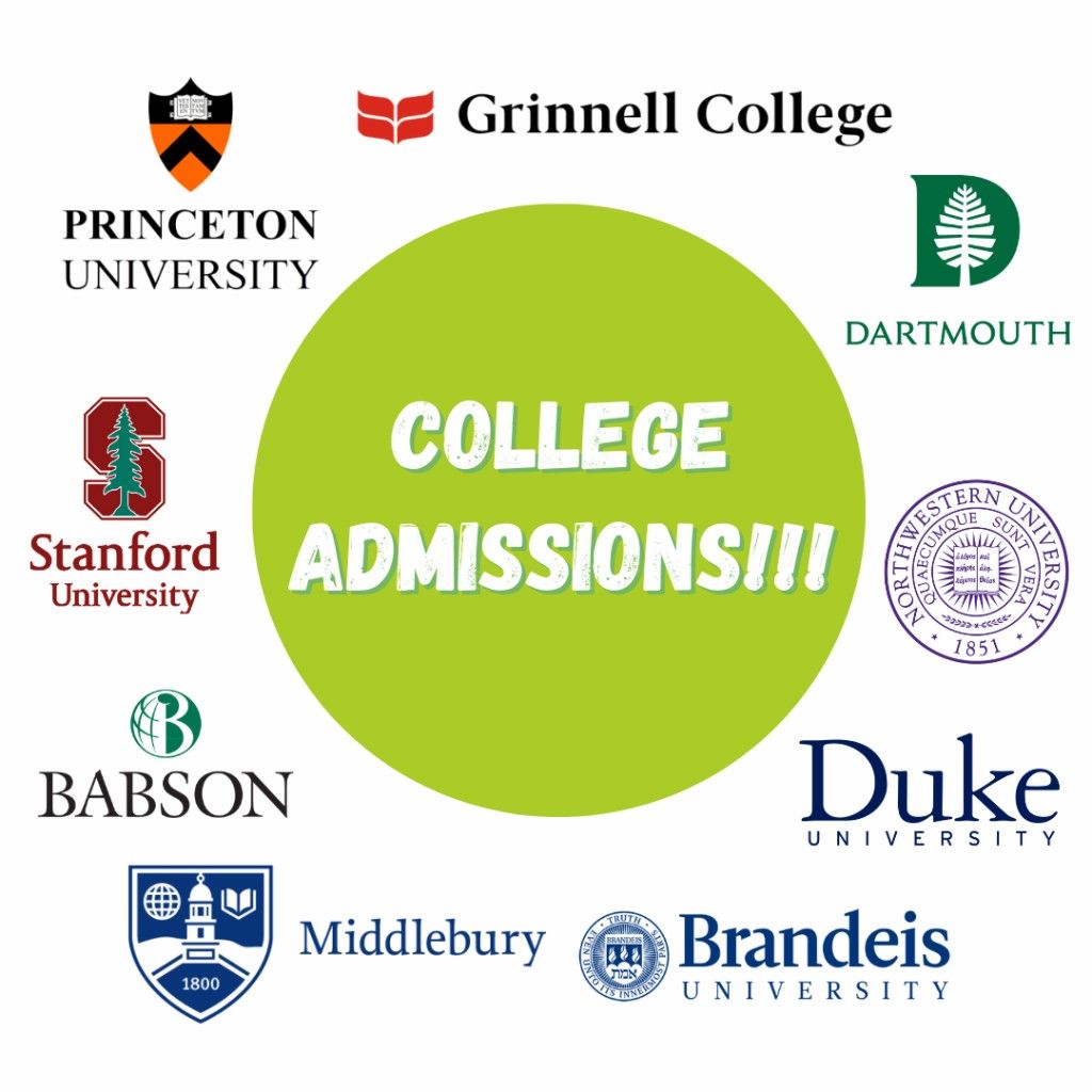 Exciting News! We’re very proud to announce that five of our recent graduates have been granted collage admissions on full scholarships to Babson, Brandeis, Dartmouth, Duke, Grinnell, Middlebury, Northwestern, Princeton, and Stanford, among several others.